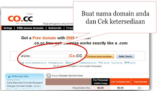 Melanjutkan tulisan cara membuat website gratis, artikel ini akan memberi petunjuk langkah - langkah mendaftarkan nama domain yang gratis pula. Dan penyedia nama domain yang pilih adalah dari domain co.cc, sebab seperti yang sudah kita ketahui, bahwa co.cc adalah top level domain yang bisa kita dapatkan secara gratis. Disamping itu kita bisa mengontrol DNS Records, A, MX, dan CNAME records, sehinga domain co.cc bukan hanya sekedar "URL Forwarding".